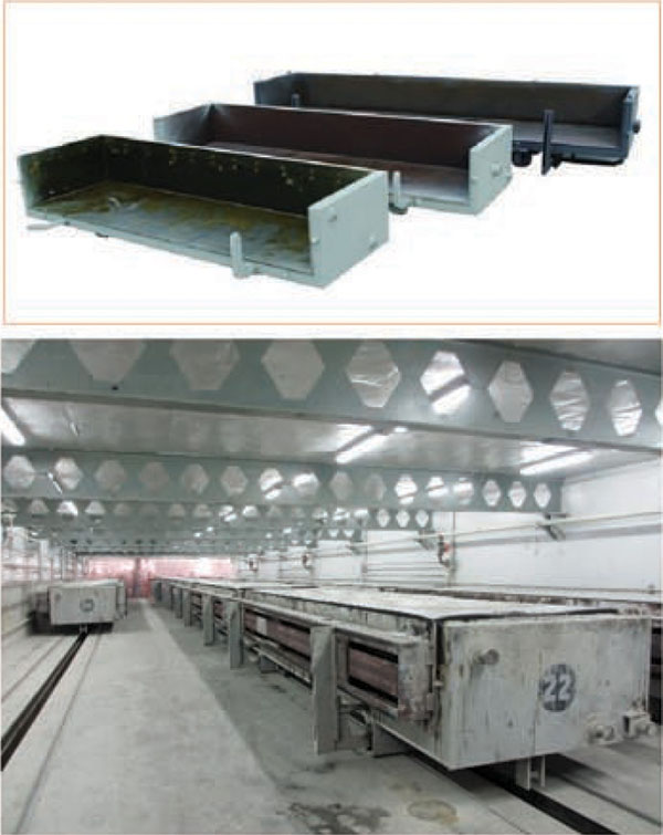 模具是承載澆注坯體的專用器具。料漿自澆注攪拌機內注入到模具中,經(jīng)發(fā)酵護養(yǎng),脫去模框,即成待切割的坯體。